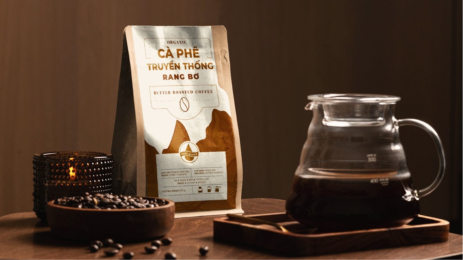 Bao bì phong cách vintage tái hiện không khí hoài niệm, gợi về những giá trị truyền thống của cà phê. Tông màu thường sử dụng gồm nâu gỗ, be, đỏ trầm hoặc xanh rêu kết hợp texture giấy kraft hoặc hiệu ứng cũ nhẹ.